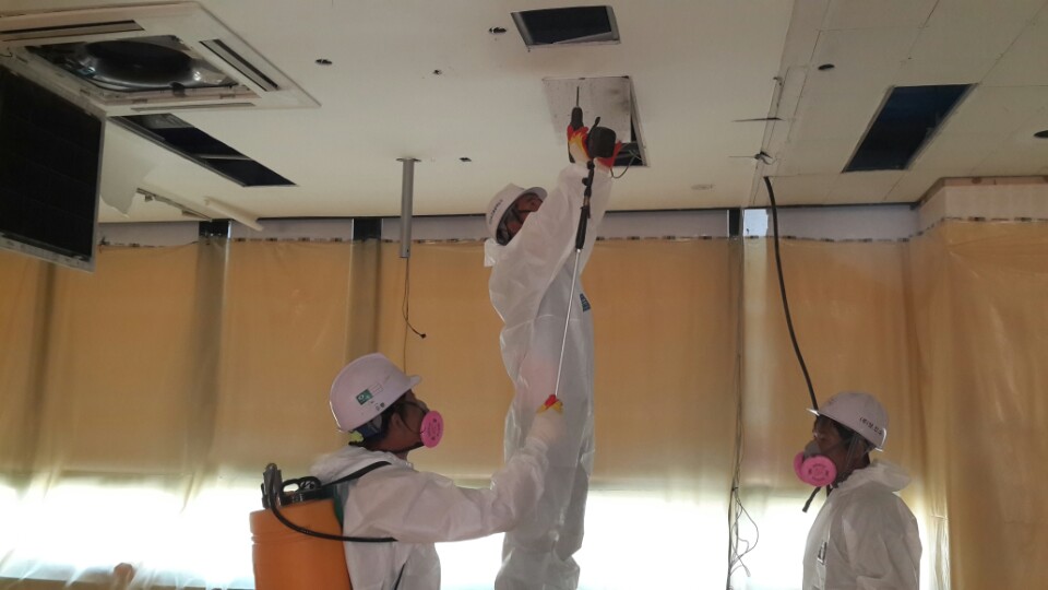 ![]() 천정 석면텍스를 습윤작업과 함께 해체 하는 모습입니다. |