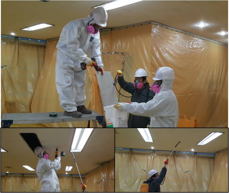 ![]() 천정 석면텍스를 습윤작업과 함께 해체 작업 중인 사진들입니다. |