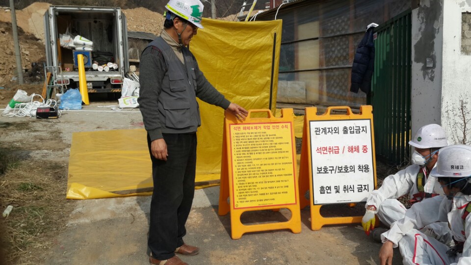 ![]() 슬레이트 해체 작업전 현장에서 안전교육을 실시하고 있습니다. |
