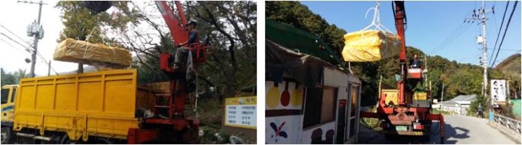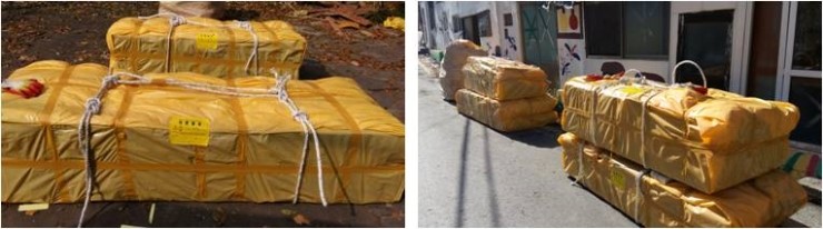 석면폐기물 처리 사진 (폐기물 포장 폐기물 운반) 석면슬레이트는 불침투성 비닐로 이중포장을 하고 지정된 차량으로 운반/매립처리 하였습니다. |